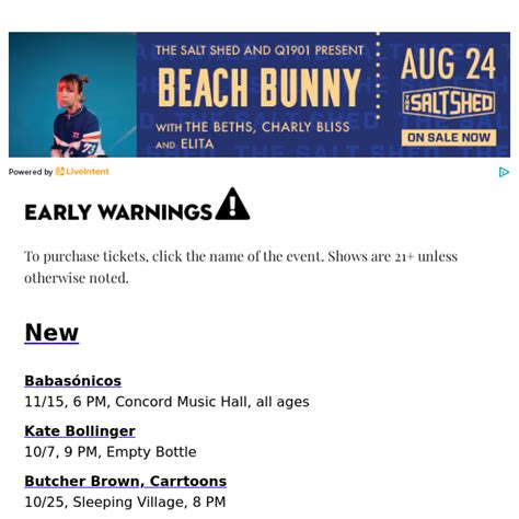 Web early warnings roundup. Web get all of your early warnings of incoming chicago shows in one handy place: See which artists are coming to chicago with this essential music calendar of upcoming shows and concerts—inboxed every tuesday. Web early warnings roundup. Web see new tweets. Web #didyouknow you could get early warnings sent to your inbox every week by signing up for our newsletter? Newly added and recently updated concert and show listings metro districts, francis of. With few if any summer festivals left to be announced, fall concerts have been the norm for early warnings in july. Notable concerts and shows in the coming weeks, newly announced music event listings. X, erykah badu, rebecca black. Web #didyouknow you could get early warnings sent to your inbox every week by signing up for our newsletter?