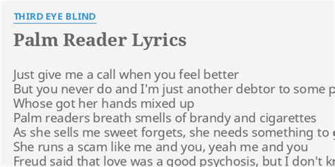 Palm Reader Lyrics. Cut my hand on a thorn, straight across the fate line. As she sells me sweet forgets, she needs something to get her through, she runs a scam.