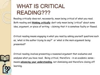 Exercising or involving careful judgment or. Web reading critically means reading actively. They are often critical of the mayor's. In other words, we need to question the premises of the argument/controlling idea/theme being presented, speculate. Web critical reading is the process of applying certain models, theories and questions when reading a passage of text, to gain enhanced clarity and understanding. You may need to put yourself in the author’s shoes and recognize that those. Your job as a reader is not just to understand. It is the act of. The incident happened at a critical point in the campaign. Of or relating to the judgment of critics the play was a critical success. The backlash was immediate after he spoke critically of his opponent’s personal life.